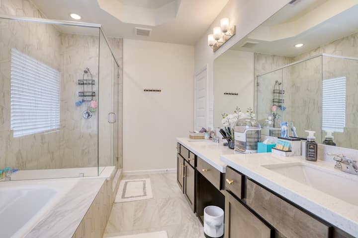 Discover a stylish, family-friendly retreat just minutes from downtown Houston. This newly built home features a luxurious bathroom with a bathtub, an entertainment-ready game room, and a spacious open-concept living area with natural light. Enjoy the fully equipped kitchen, smart amenities, and private backyard inside a secure gated community. Perfectly located near museums, parks, shopping, and dining, it’s the ideal home base for your Texas stay.